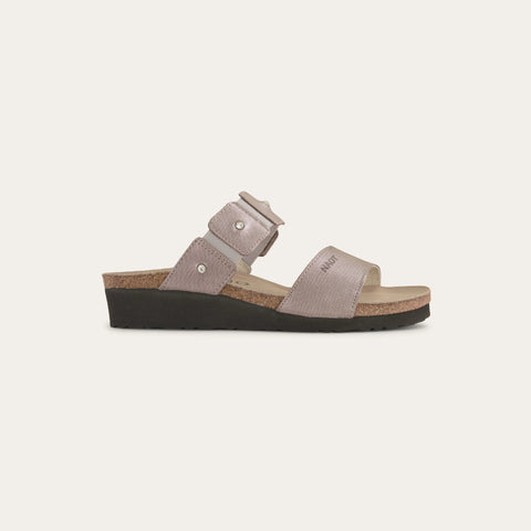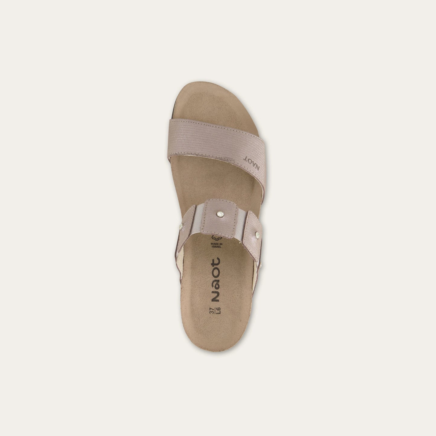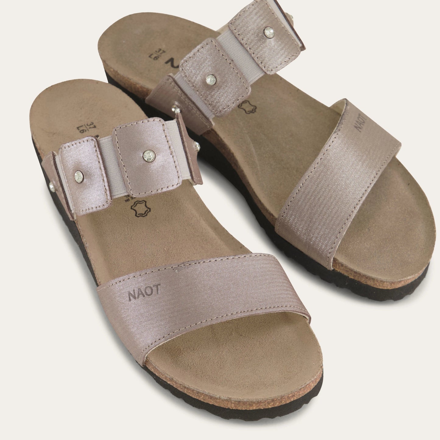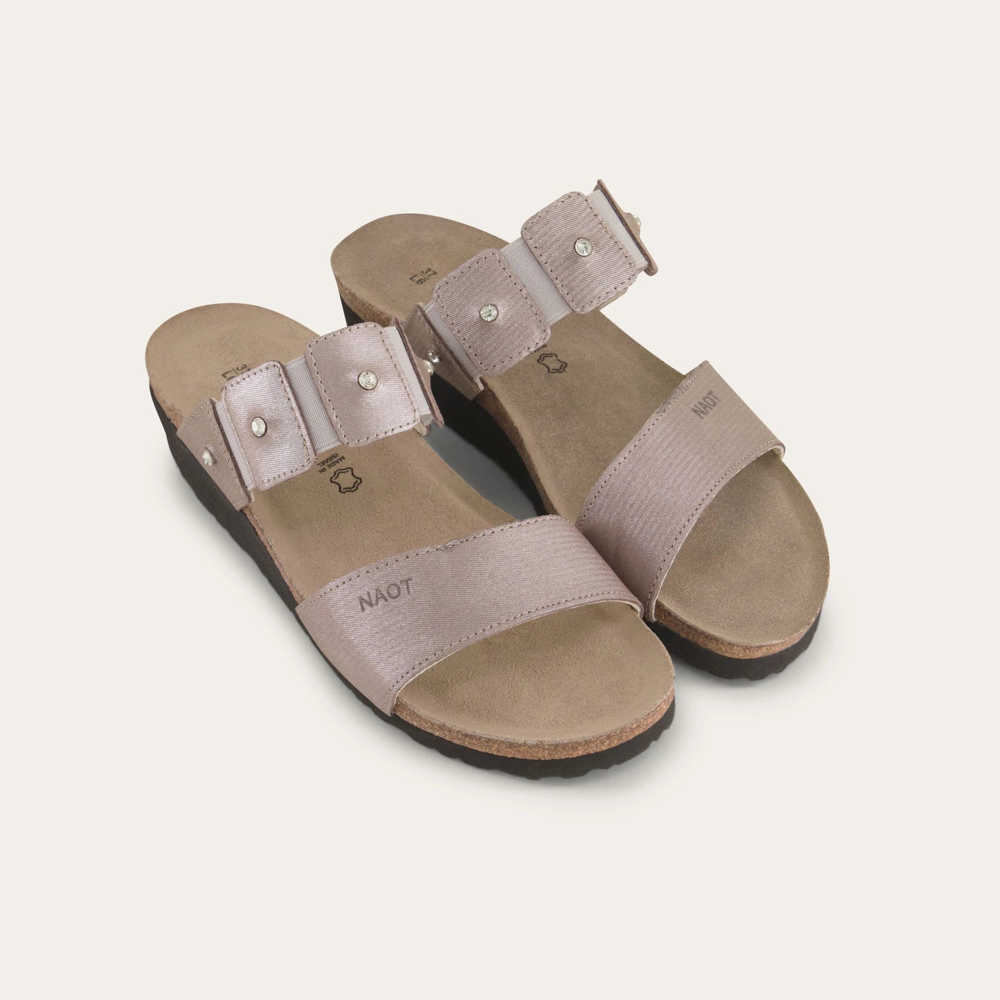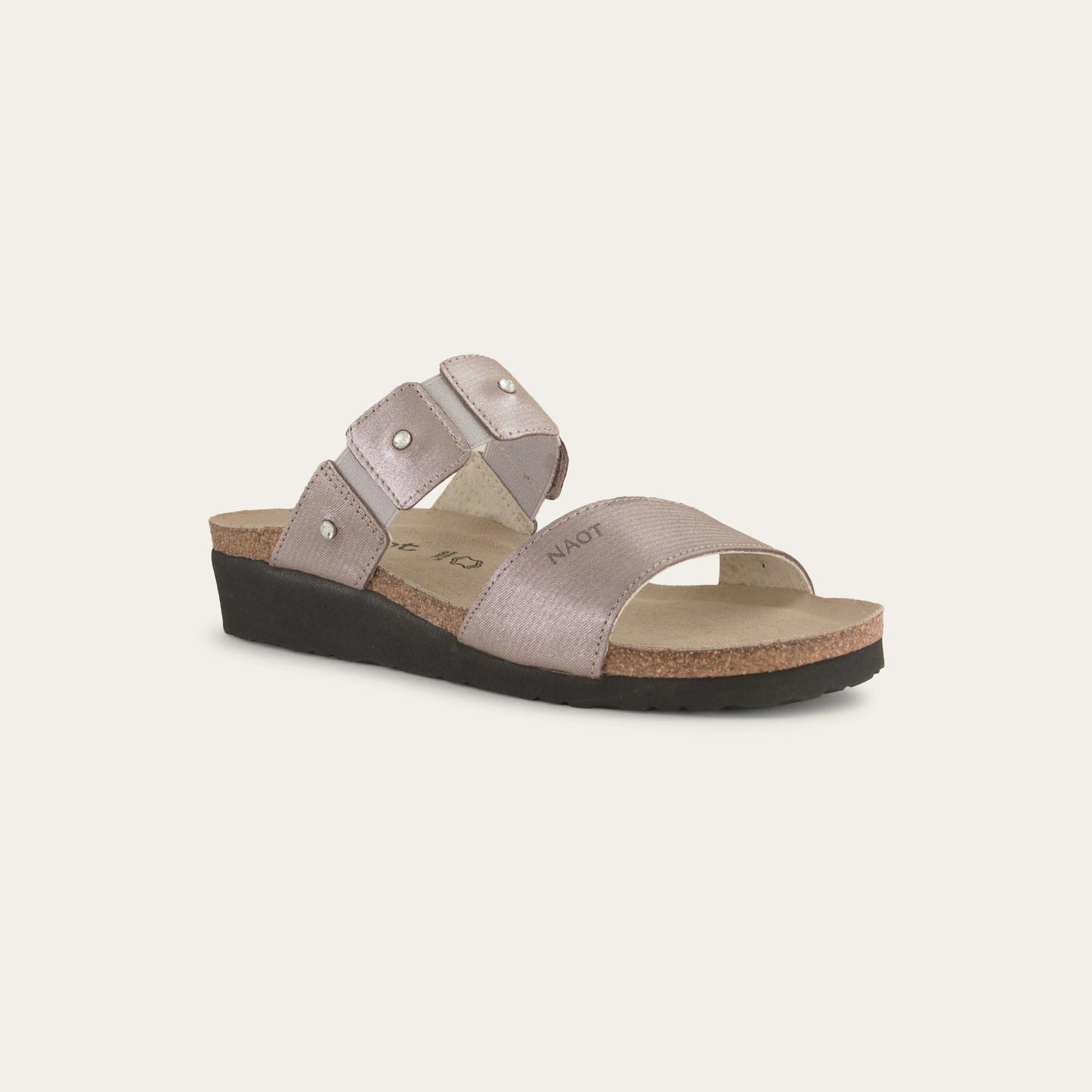 The Naot Ashley is a feminine slide sandal with rhinestone accents across the instep and gore for adjustability. Naot's anatomic cork & latex footbed is wrapped in a pampering suede and molds to the shape of the foot with wear. American Podiatric Medical Association (APMA) Accepted for promoting good foot health.