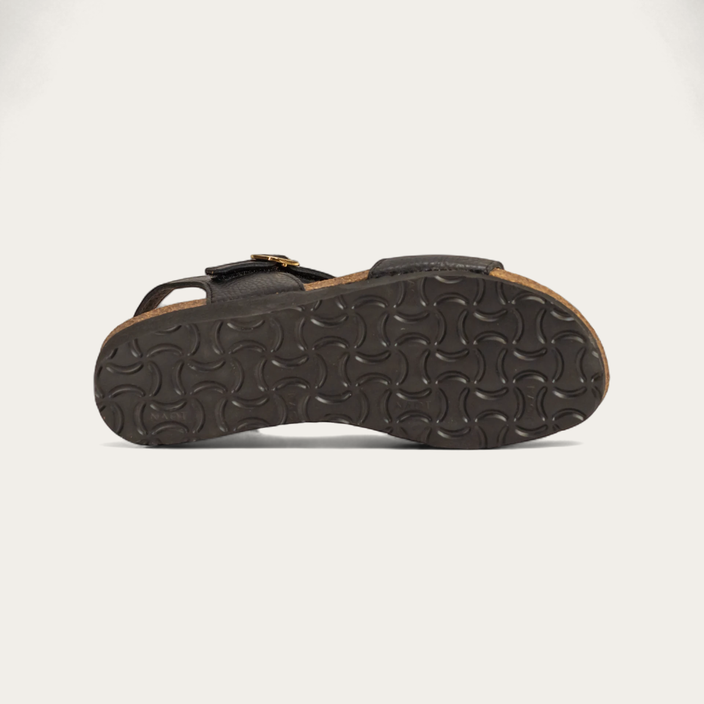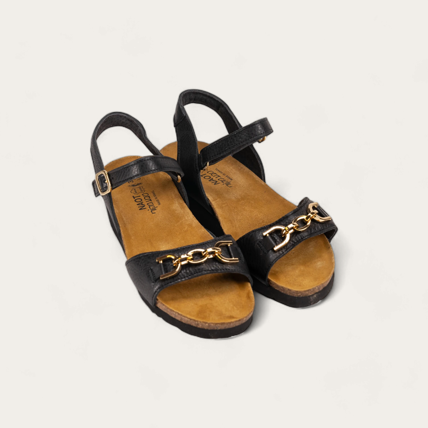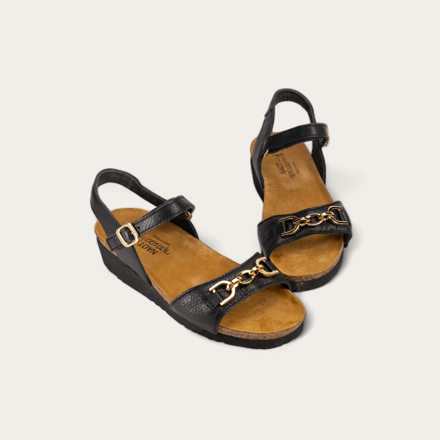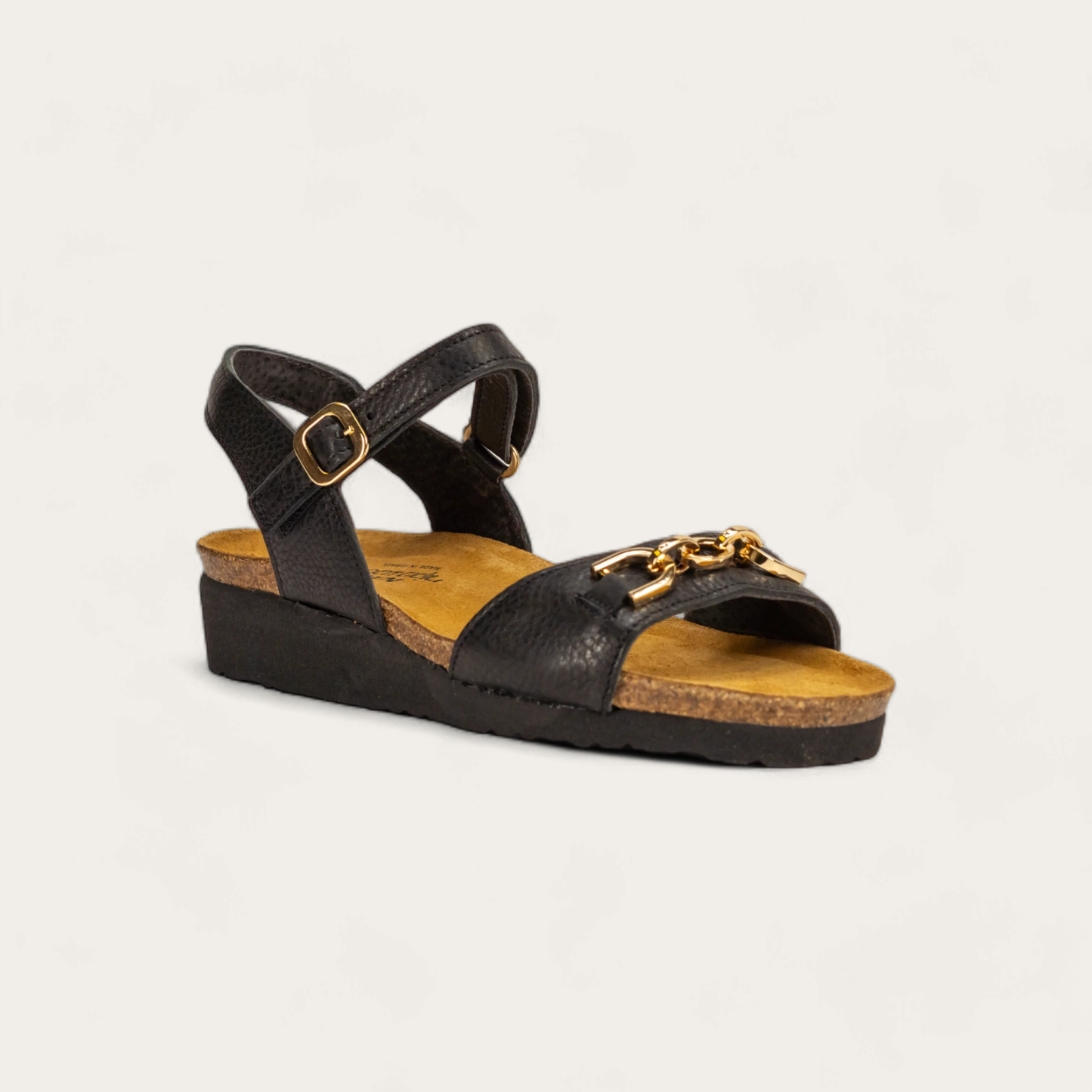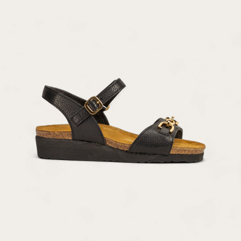 Naot Aubrey is an effortlessly elegant sandal with gold tone chain strap accent. The Aubrey features hook & loop strap at the instep and a backstrap with gore for stability and support. Naot's anatomic cork & latex footbed is wrapped in a pampering suede and molds to the shape of the foot with wear. American Podiatric Medical Association (APMA) Accepted for promoting good foot health.
