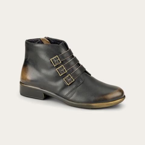 The Naot Calima is a chic bootie flat with an inside zipper. This style features buckles with hidden gore. Naot's removable, anatomic cork & latex footbed is wrapped in microfiber & leather and molds to the shape of the foot with wear. The Aura Collection features a 1.5" polyurethane sole with a metal shank which is extremely lightweight, durable & abrasive to prevent slipping. This collection uses a hand-sewn Strobel construction making it strong and extremely flexible. Our patented Naot Replacement Footbeds are also available for Calima. SIZE INFO: * 4" Shaft Height * 10 " Shaft Circumference * Product measurements were taken using size 37 (US Women's 6), Width M * Please note that measurements may vary by size DETAILS:
