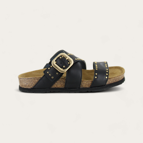 Crisscross strap design and hand studded smooth leather, the Naot Carolina sandal is the coolest everyday slide. Naot's anatomic cork & latex footbed is wrapped in a pampering suede and molds to the shape of the foot with wear. The Classic Collection features a 1.25" EVA sole. American Podiatric Medical Association (APMA) Accepted for promoting good foot health.