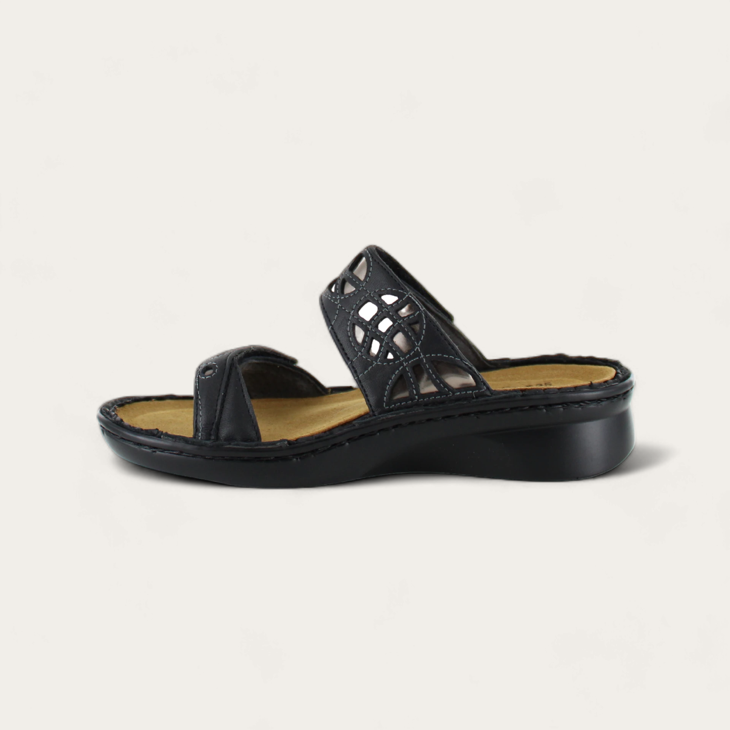 The Cornet is a chic slide sandal with stitch designs and contrasting polyurethane underlay. This style features a double hook and loop for complete adjustability. Naot's removable, anatomic cork & latex footbed is wrapped in pampering suede and molds to the shape of the foot with wear. The Allegro Collection features a 1.5" polyurethane sole which is extremely lightweight and durable. Our patented Naot Replacement Footbeds are also available for Cornet.