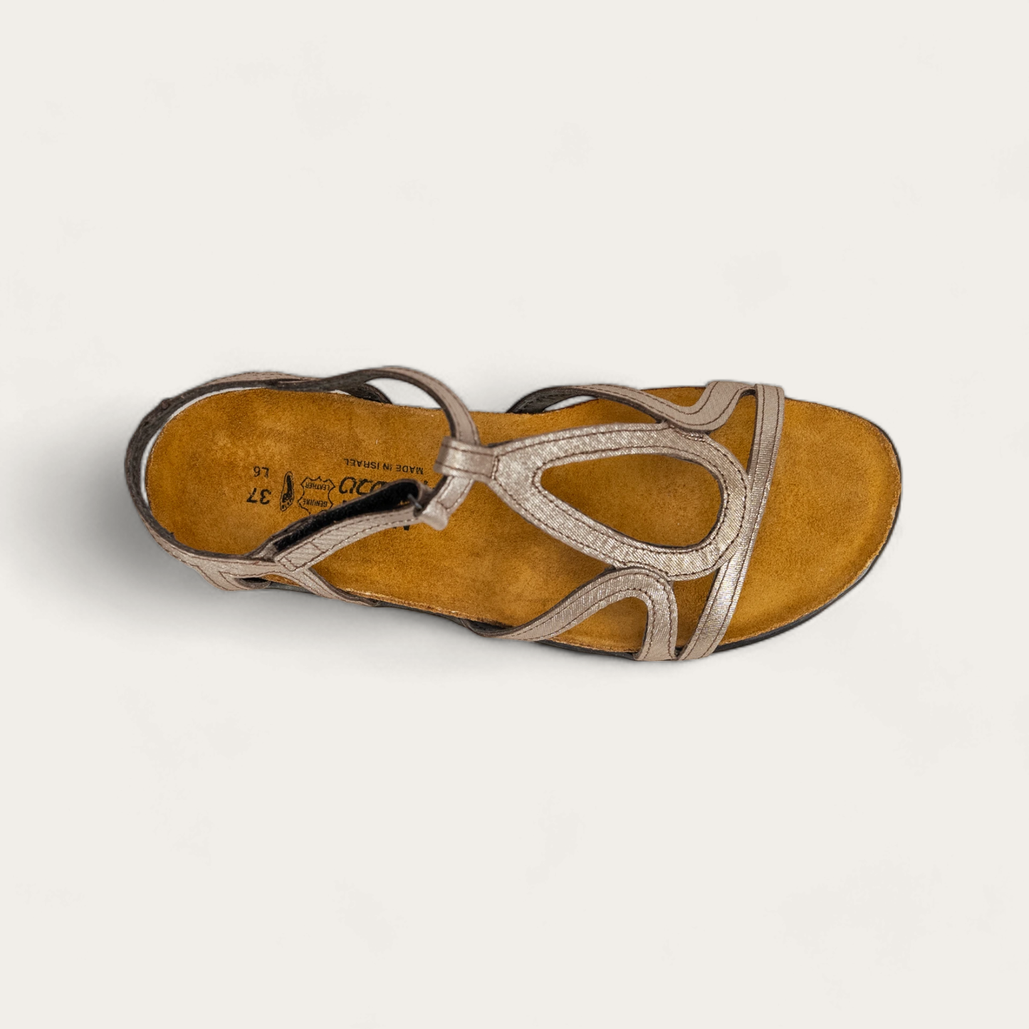 The Dorith is gladiator inspired sandal with a hook & loop strap and backstrap for added stability and support. The Dorith has a feminine design at the front. Naot's anatomic cork & latex footbed is wrapped in a pampering suede and molds to the shape of the foot with wear. The Flat Elegant Collection features a .75" TPR sole.