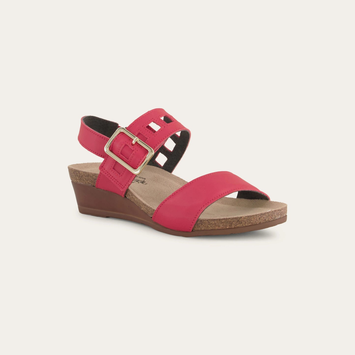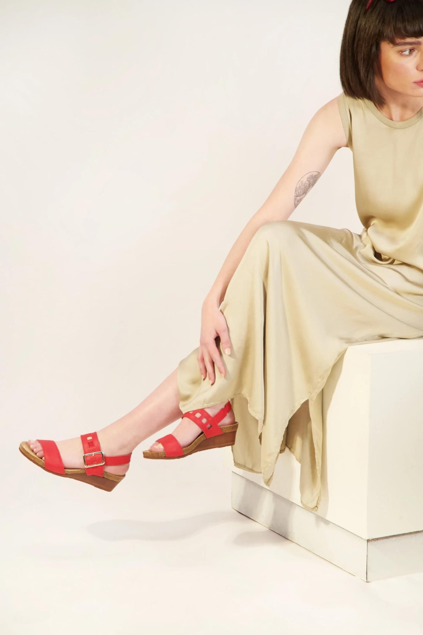 Love these sandals. Soft leather, very comfortable, love the style and height. The colour is as shown on the website - lovely red.
