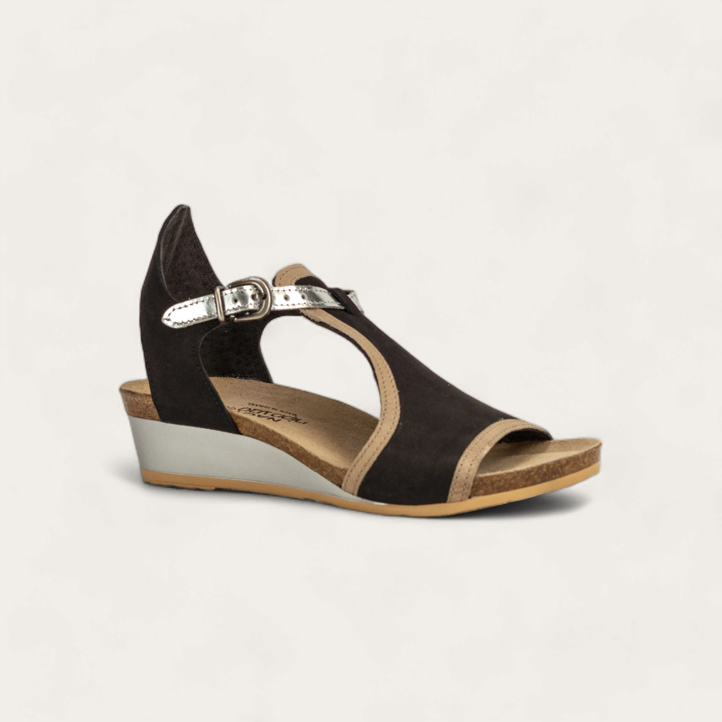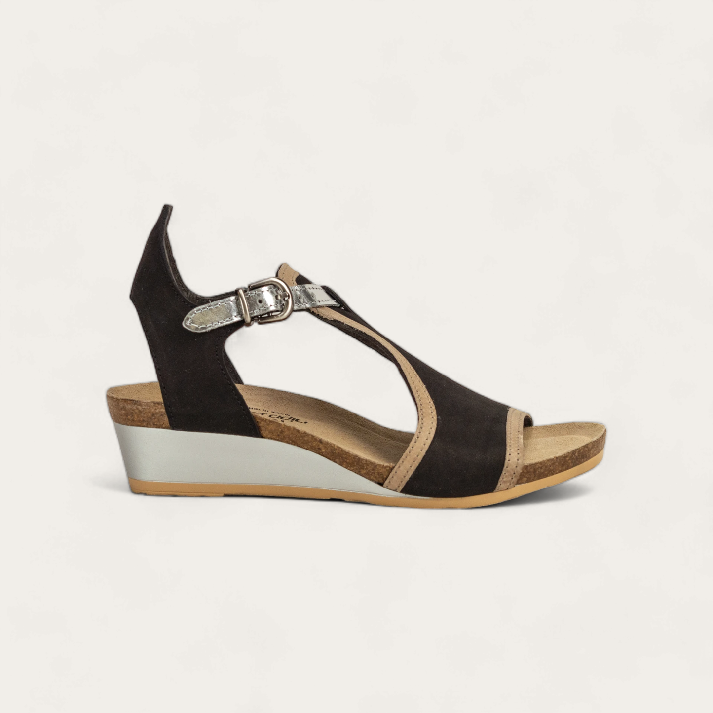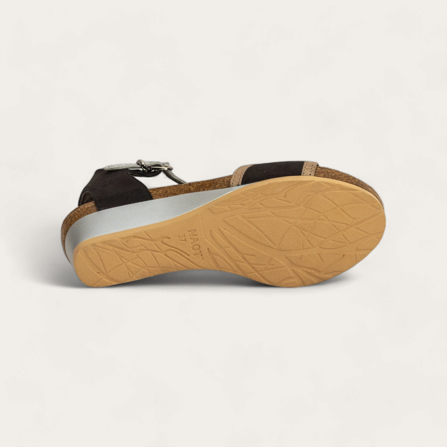 The Fiona is the perfect transitional wedge. This style features a full coverage upper with a contrasting trim. A functioning buckles creates accessibility while the padded heel cup provides comfort. Naot's anatomic cork & latex footbed is wrapped in a pampering suede and molds to the shape of the foot with wear.