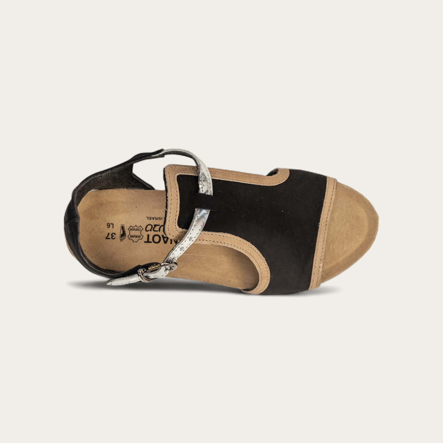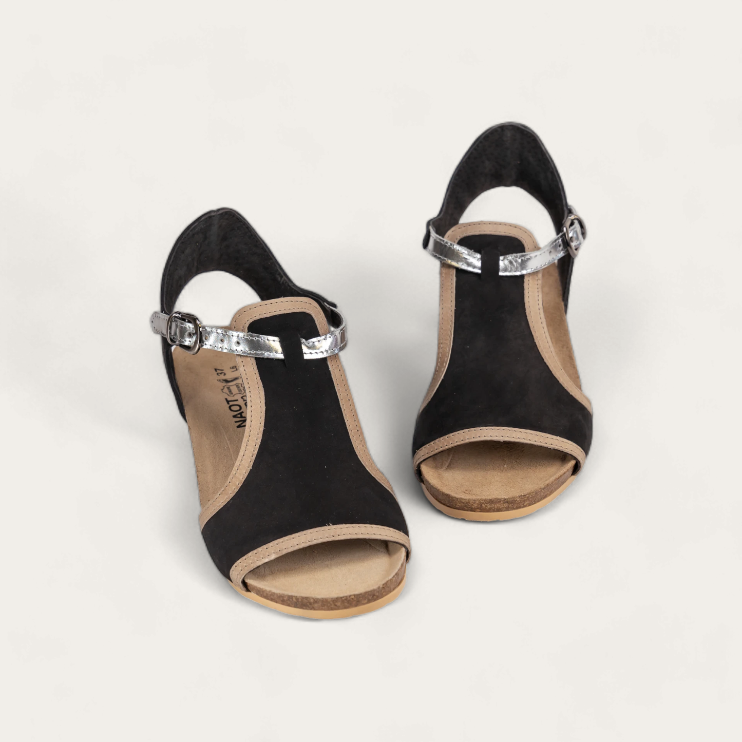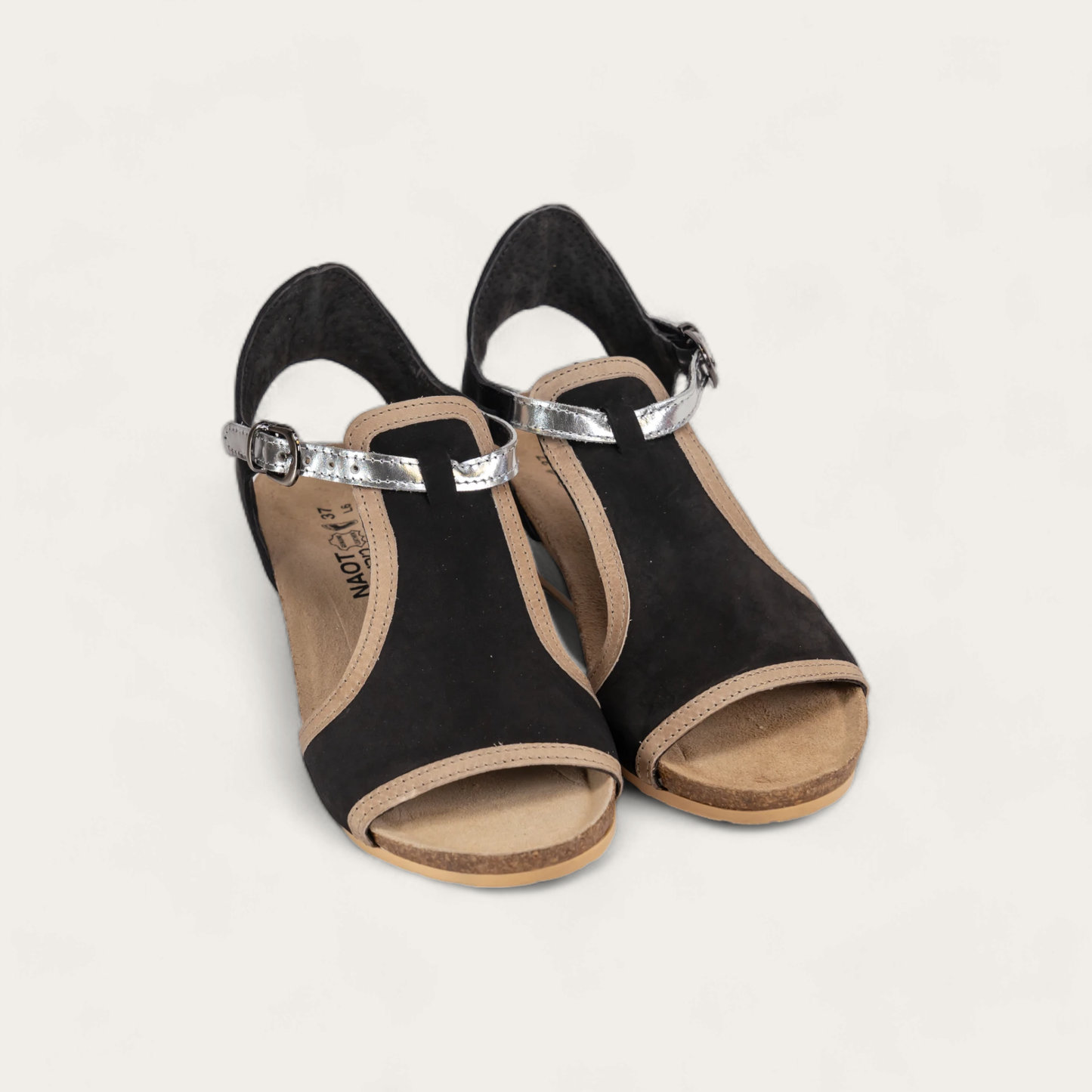 The Fiona is the perfect transitional wedge. This style features a full coverage upper with a contrasting trim. A functioning buckles creates accessibility while the padded heel cup provides comfort. Naot's anatomic cork & latex footbed is wrapped in a pampering suede and molds to the shape of the foot with wear.