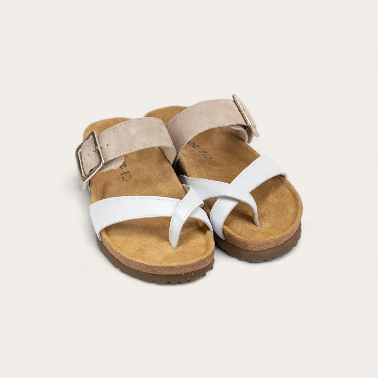 The Naot Fresno is a toe loop slide sandal featuring a contrast of leather and suede straps. With an oversized buckle that makes a statement, the Fresno also has hidden gore attached to the buckle for extra adjustability. Naot's anatomic cork & latex footbed is wrapped in a pampering suede and molds to the shape of the foot with wear. The Classic Collection features a 1.25" EVA sole. American Podiatric Medical Association (APMA) Accepted for promoting good foot health.