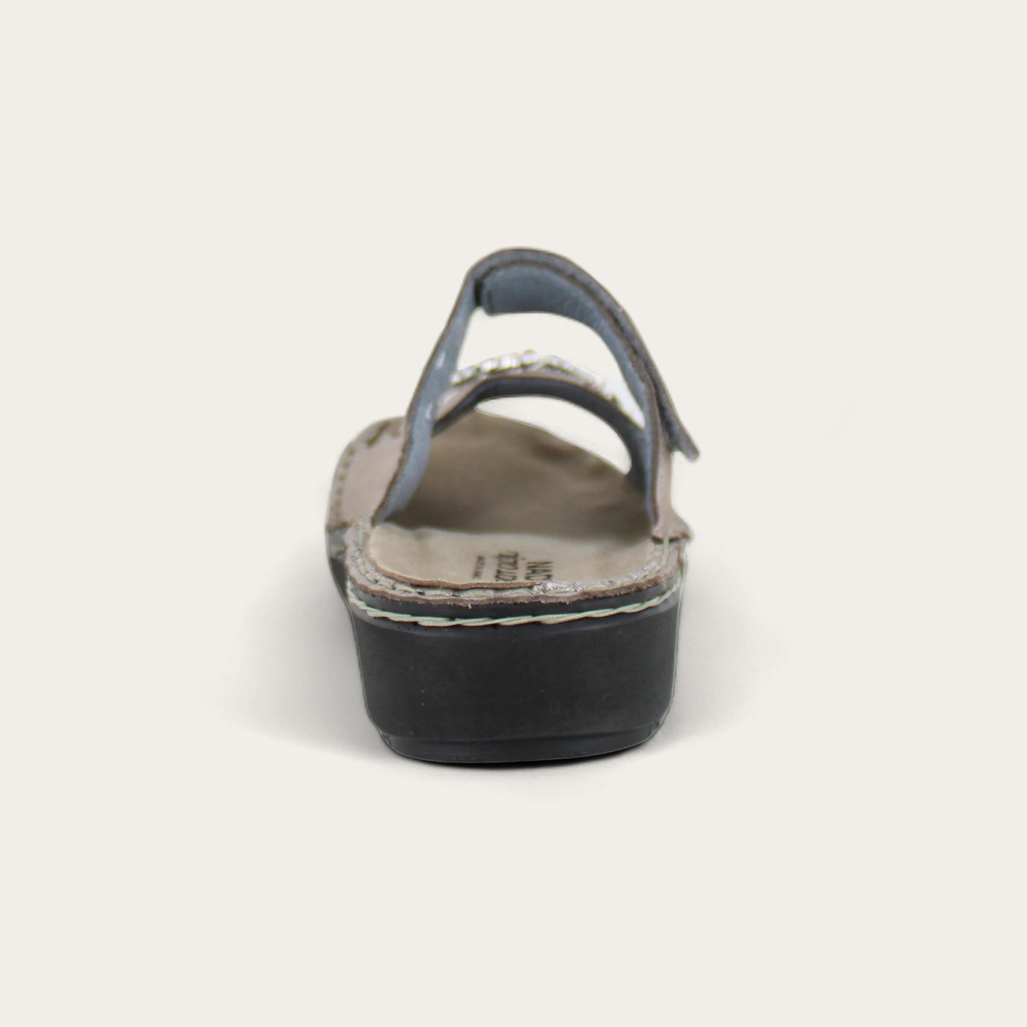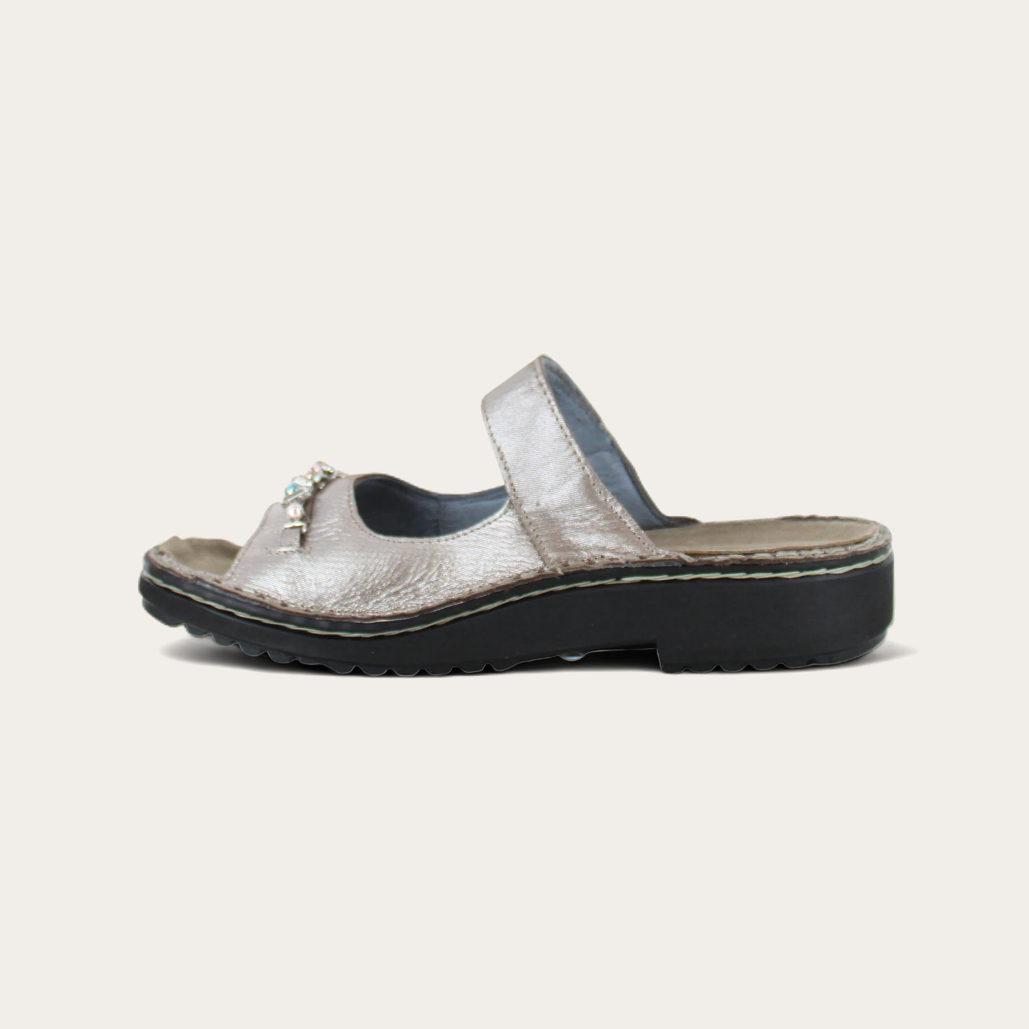 Naot Johanna is a stylish sandal with delicately crafted rhinestones on the toe strap. Naot's removable, anatomic cork & latex footbed is wrapped in pampering suede and molds to the shape of the foot with wear. The Scandinavian Collection features a 1.25" polyurethane sole which is extremely lightweight and durable. American Podiatric Medical Association (APMA) Accepted for promoting good foot health. Our patented Naot Replacement Footbeds are also available for Johanna.