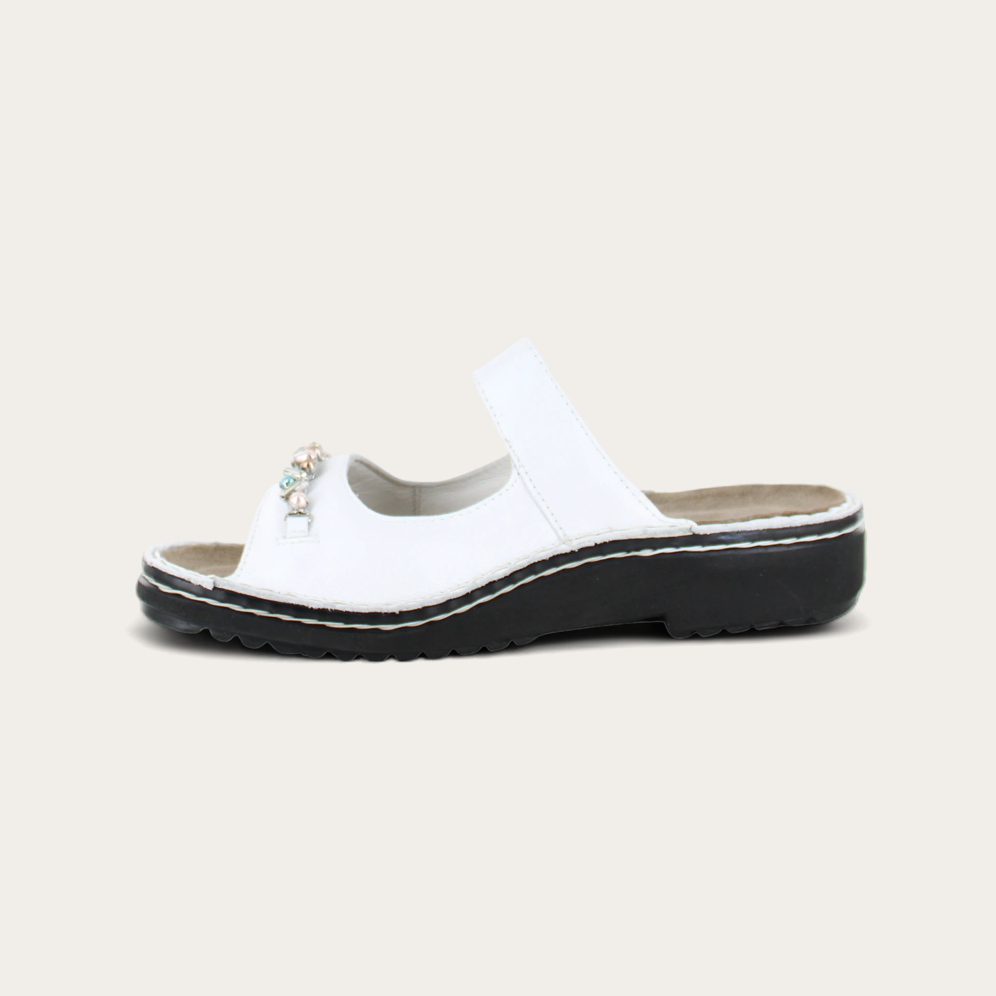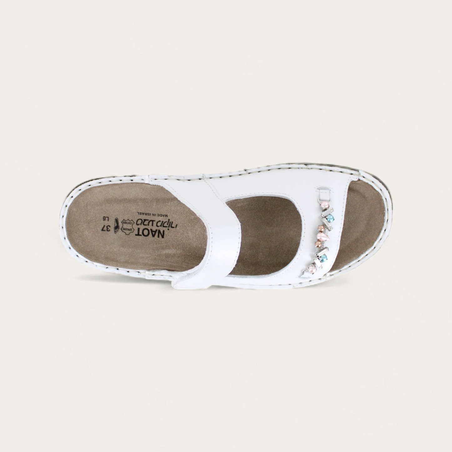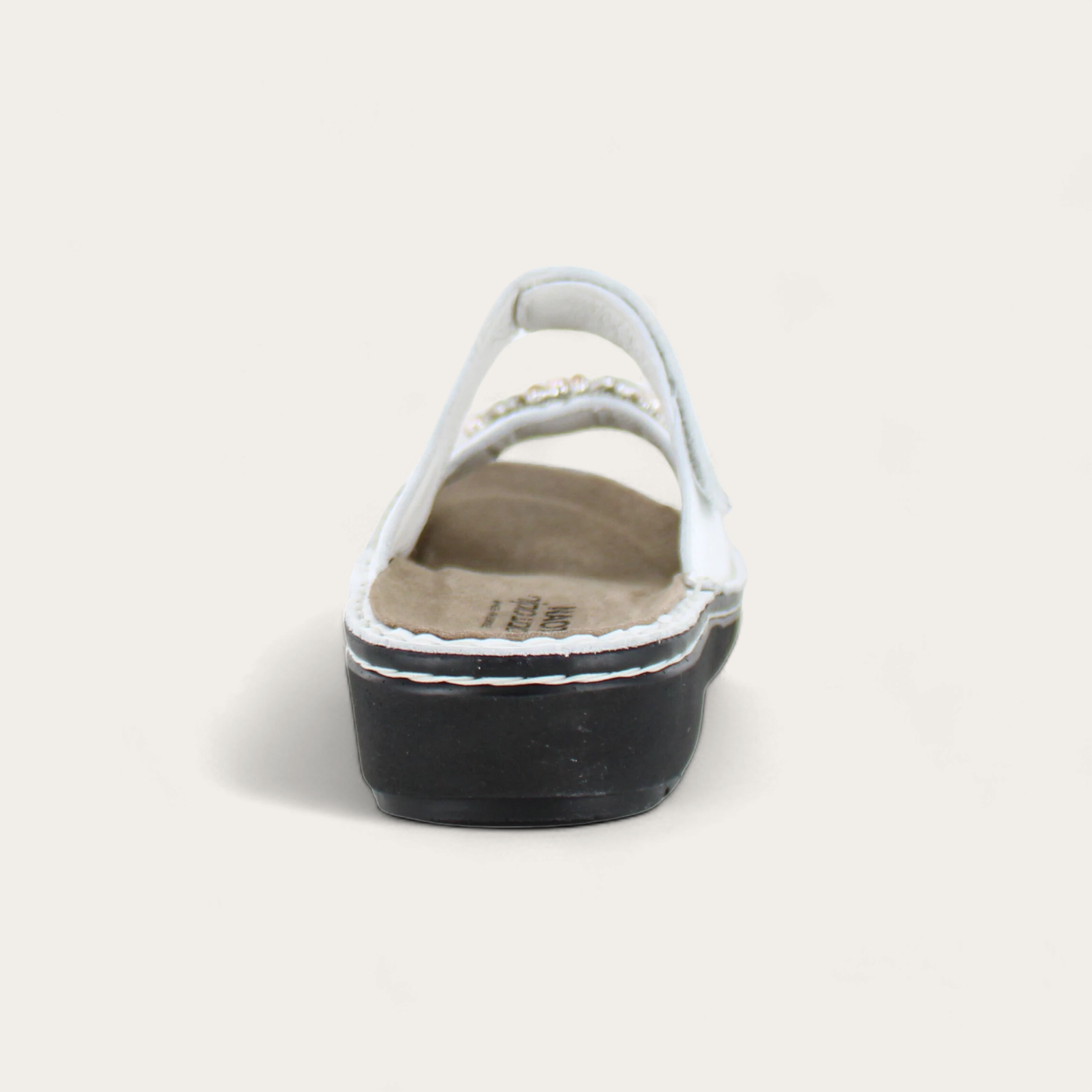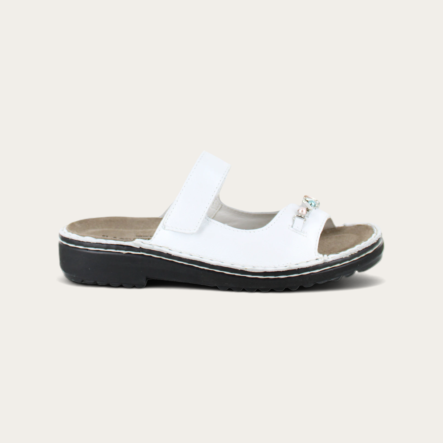 Naot Johanna is a stylish sandal with delicately crafted rhinestones on the toe strap. Naot's removable, anatomic cork & latex footbed is wrapped in pampering suede and molds to the shape of the foot with wear. The Scandinavian Collection features a 1.25" polyurethane sole which is extremely lightweight and durable. American Podiatric Medical Association (APMA) Accepted for promoting good foot health. Our patented Naot Replacement Footbeds are also available for Johanna.