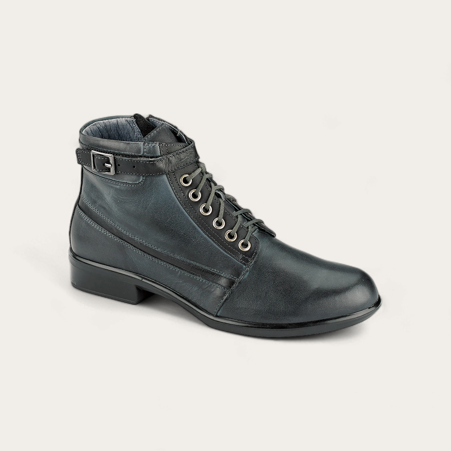The Naot Kona is fashionable boot that provides a sleek and dressy look. This style features a hook and loop faux buckle as well as a zipper. This boot has padded technical lining for comfort, warmth & moisture absorption. Naot's removable, anatomic cork & latex footbed is wrapped in microfiber & leather and molds to the shape of the foot with wear. The Aura Collection features a 1.5" polyurethane sole with a metal shank which is extremely lightweight, durable & abrasive to prevent slipping. This collection uses a hand-sewn Strobel construction making it strong and extremely flexible. Our patented Naot Replacement Footbeds are also available for Kona. SIZE INFO: * 4" Shaft Height * 8.5" Shaft Circumference * Product measurements were taken using size 37 (US Women's 6), Width M * Please note that measurements may vary by size DETAILS: