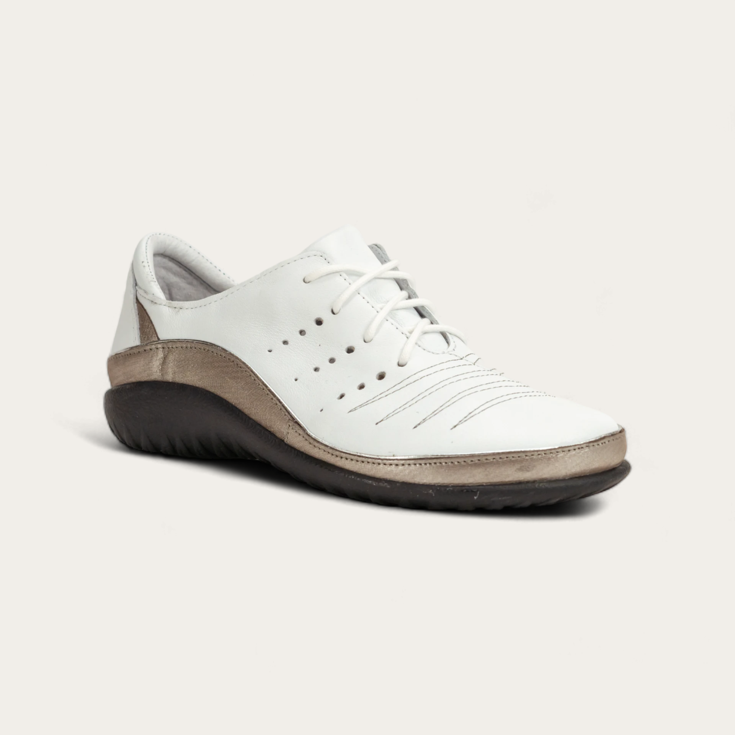 The Kumara is a great, everyday lace up shoe. This style has a slightly padded tongue and a padded heel cup for additional stability & comfort. The front portion of the Kumara features padded technical lining which provides comfort and absorbs moisture. Naot's removable, anatomic cork & latex footbed is wrapped in pampering suede and molds to the shape of the foot with wear. The Koru Collection features a 1" polyurethane sole which is extremely lightweight, durable & slip resistant. This collection uses a hand-sewn Strobel construction making it strong and extremely flexible. American Podiatric Medical Association (APMA) Accepted for promoting good foot health. Our patented Naot Replacement Footbeds are also available for Kumara.