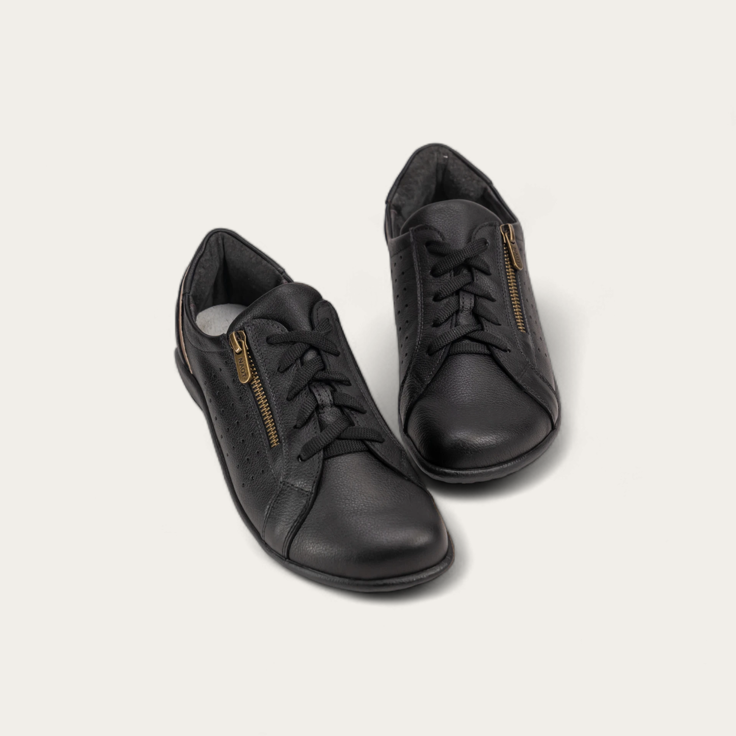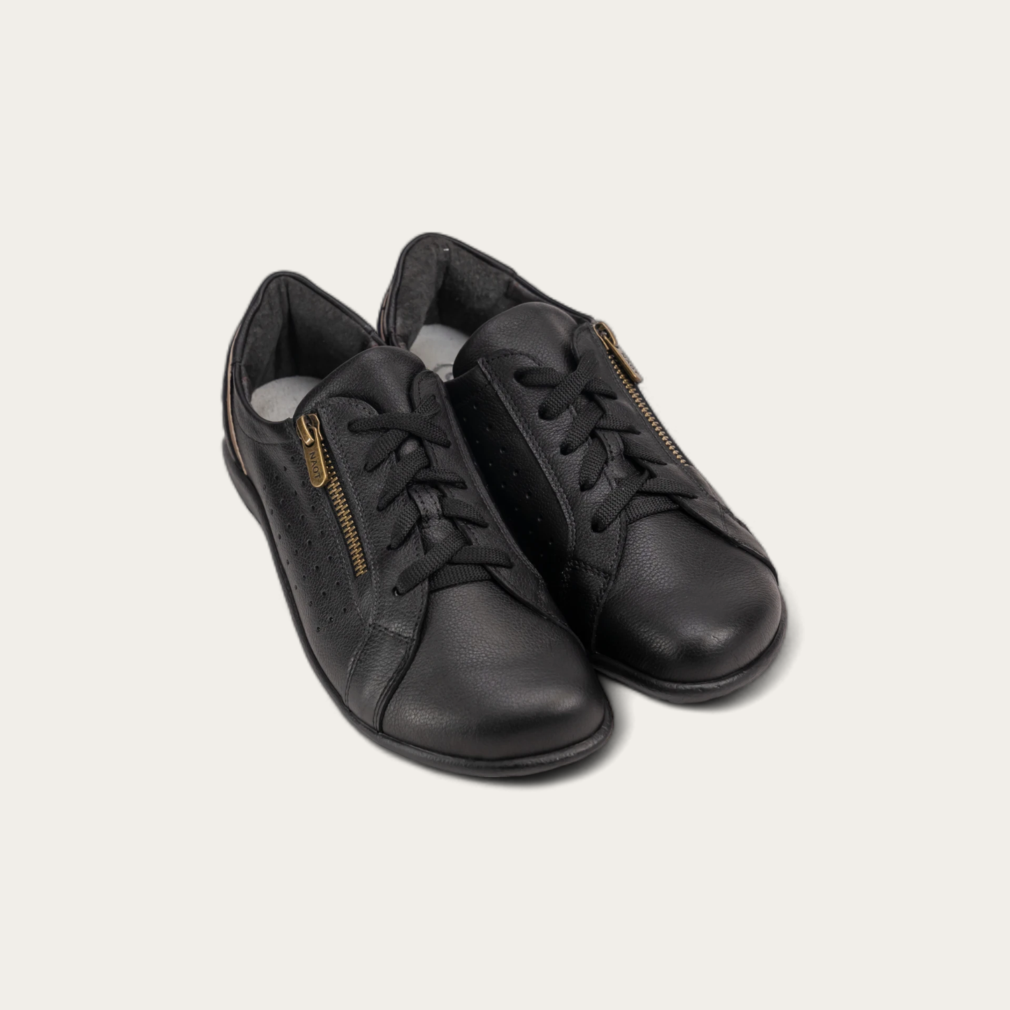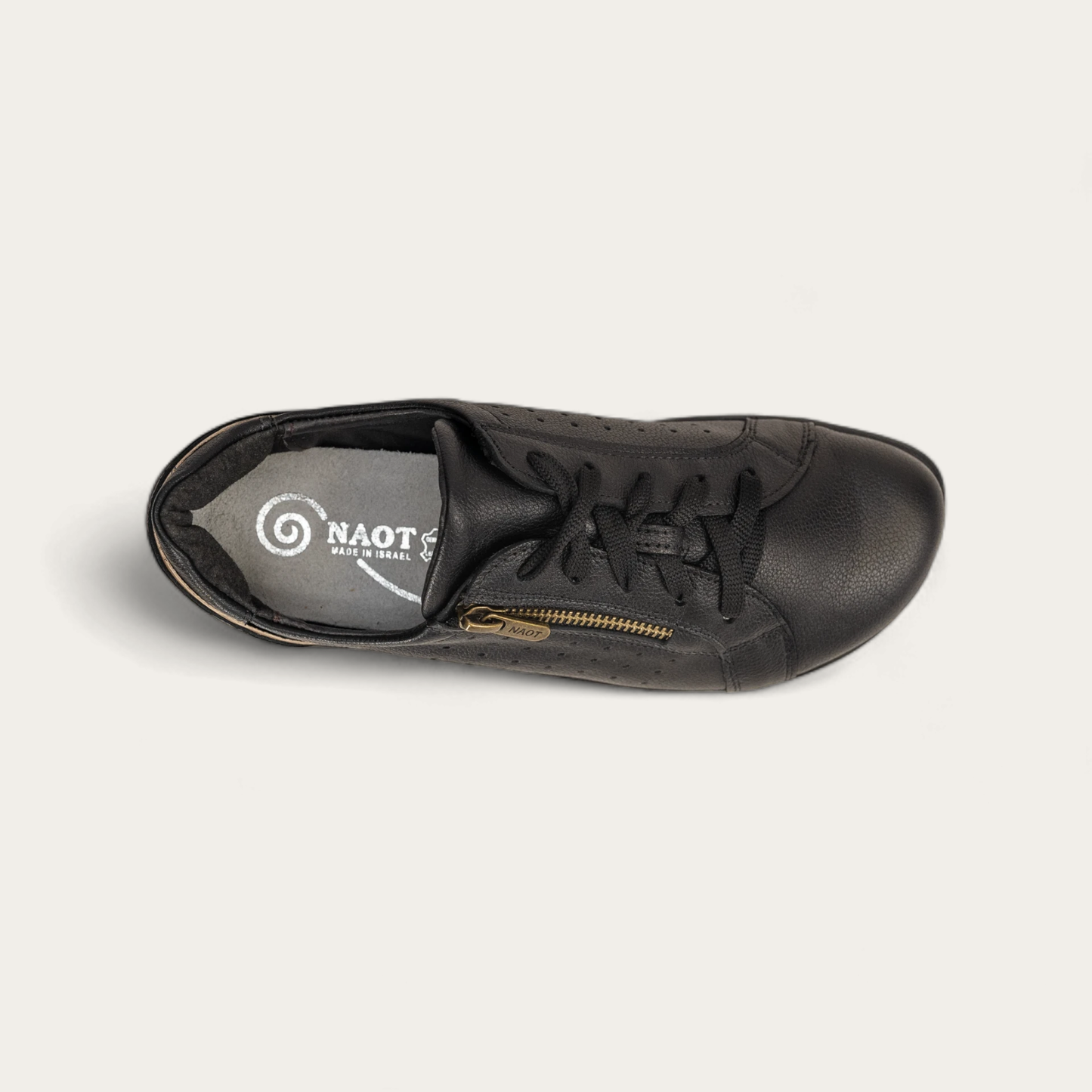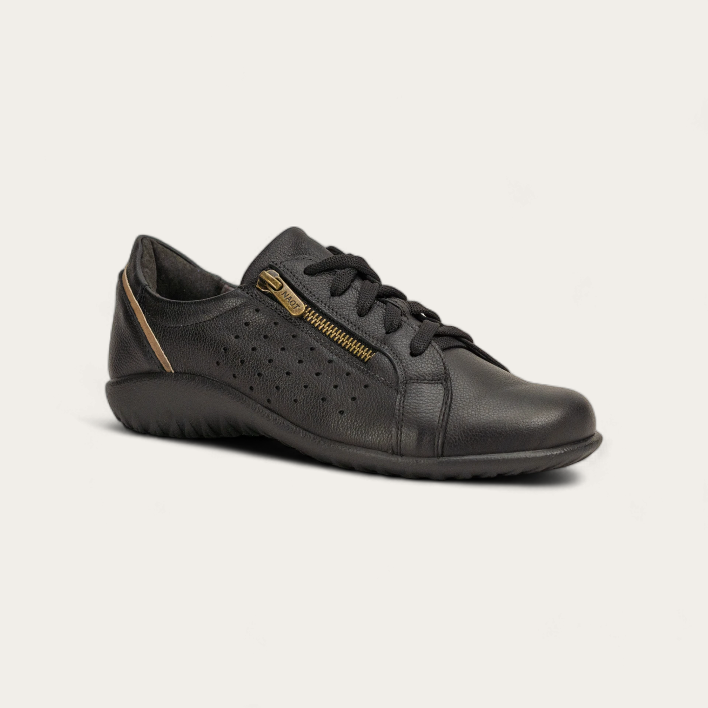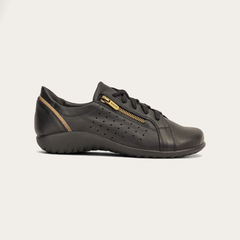 The Moko is a great, everyday lace up shoe. This style has side zippers for easy accessibility. It also features a slightly padded tongue and a padded heel cup for additional stability & comfort. Naot's removable, anatomic cork & latex footbed is wrapped in pampering suede and molds to the shape of the foot with wear. The Koru Collection features 1" polyurethane sole which is extremely lightweight, durable & slip resistant. This collection uses a hand-sewn Strobel construction making it strong and extremely flexible. American Podiatric Medical Association (APMA) Accepted for promoting good foot health.