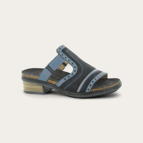 The Nifty is a unique sandal with mixed materials, colors & rivet accents. Double gore at the instep creates adjustability & a padded upper provides comfort. Naot's anatomic cork & latex footbed is wrapped in a pampering suede and molds to the shape of the foot with wear.