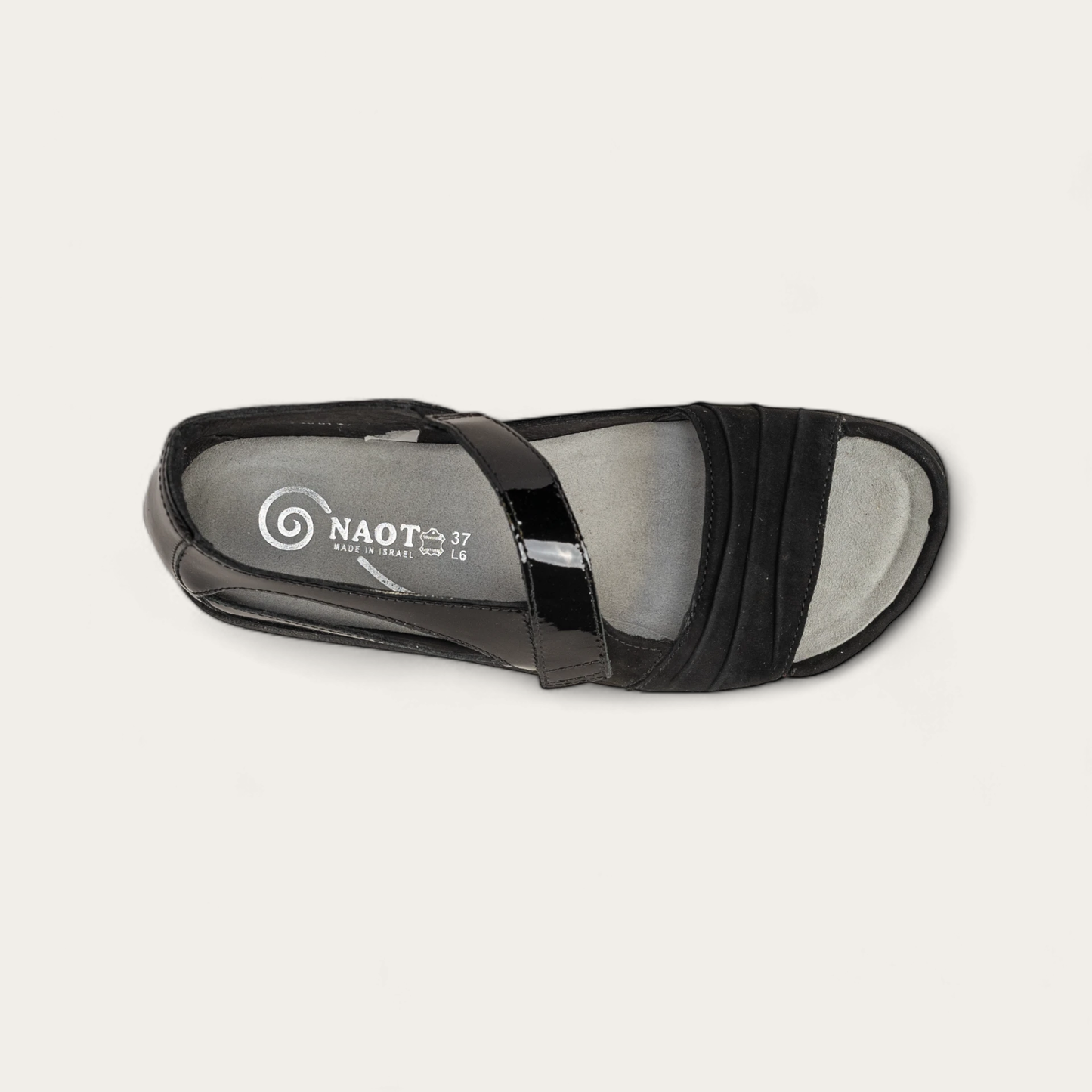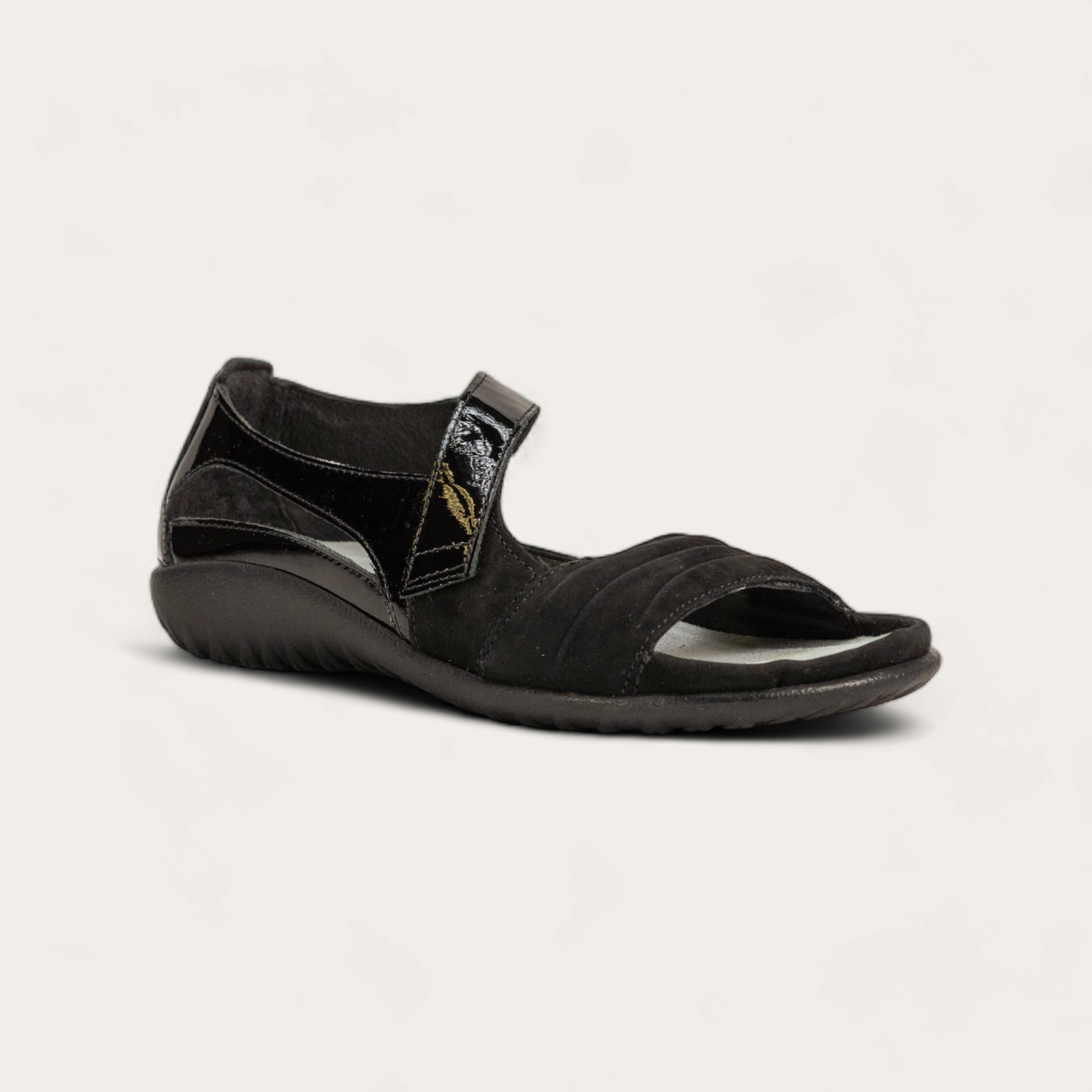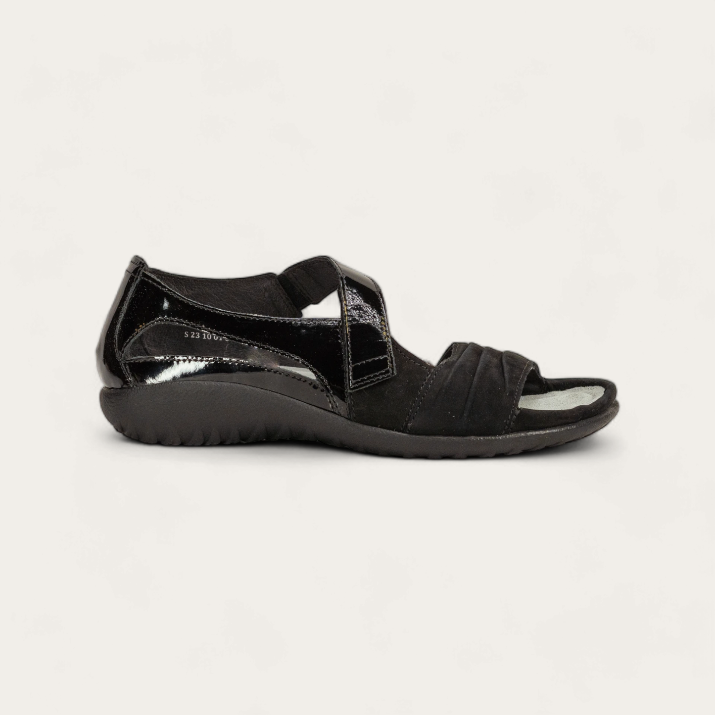 The Papaki is a fashionable sandal with a padded front strap & a contrasting ruched design. This style has a padded heel cup and a hook and loop closure at the instep. Naot's removable, anatomic cork & latex footbed is wrapped in pampering suede and molds to the shape of the foot with wear. The Koru Collection features a 1" polyurethane sole which is extremely lightweight, durable & slip resistant. This collection uses a hand-sewn stroble construction making it strong and extremely flexible. American Podiatric Medical Association (APMA) Accepted for promoting good foot health. Papaki fits our Koru Footbed.