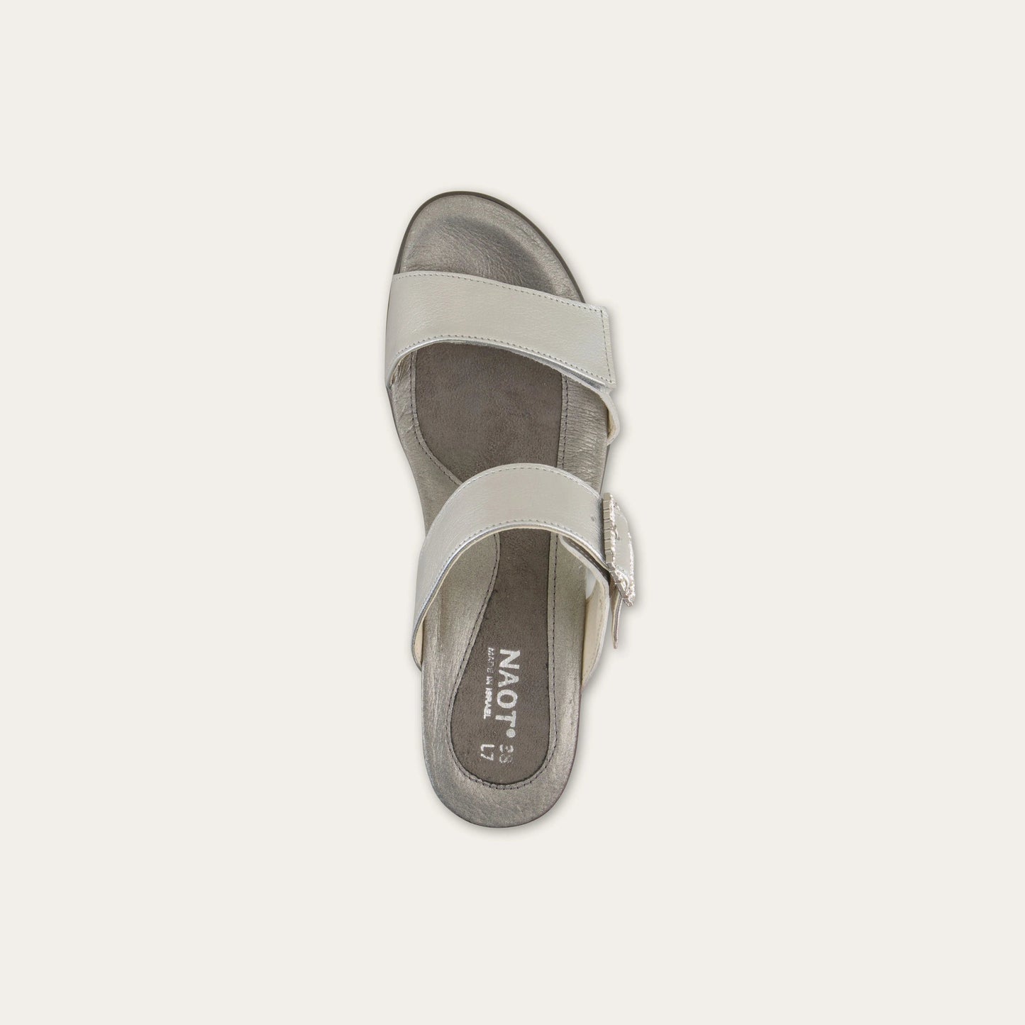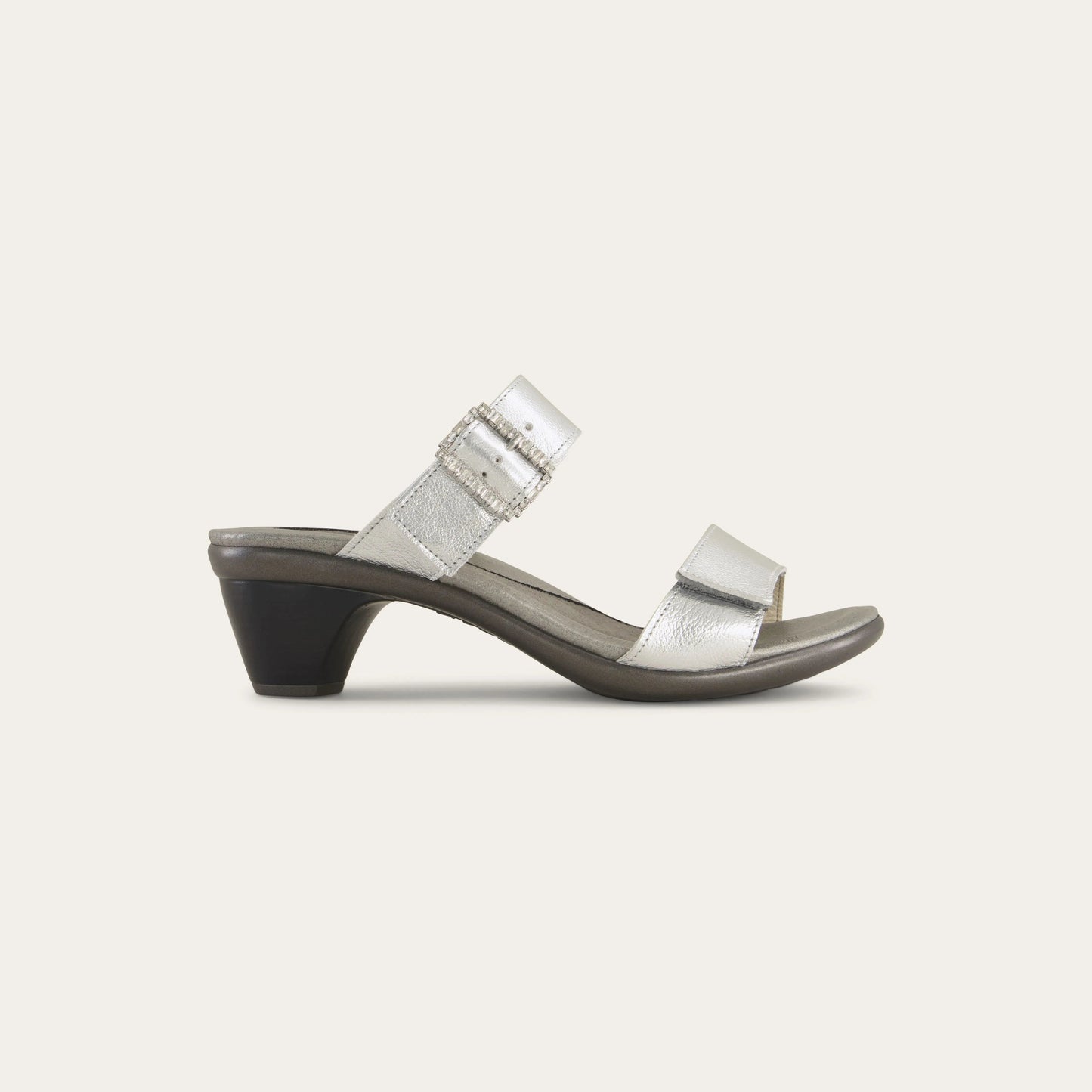Recent is a stylish sandal that is sure to catch attention. This captivating style showcases a jeweled buckle on a padded front strap, and a hook and loop ankle strap for a secure and personalized fit. Part of the Avantgarde Collection, this sandal boasts a TPR sole with a metal shank, providing the illusion of a 2" heel without sacrificing comfort.