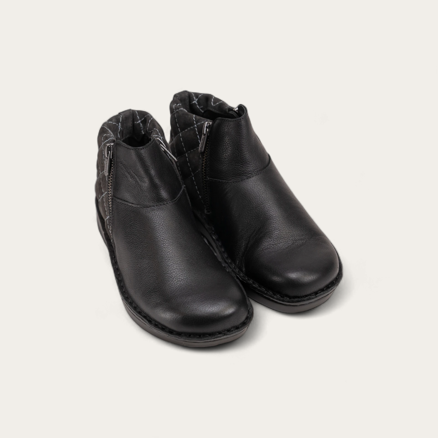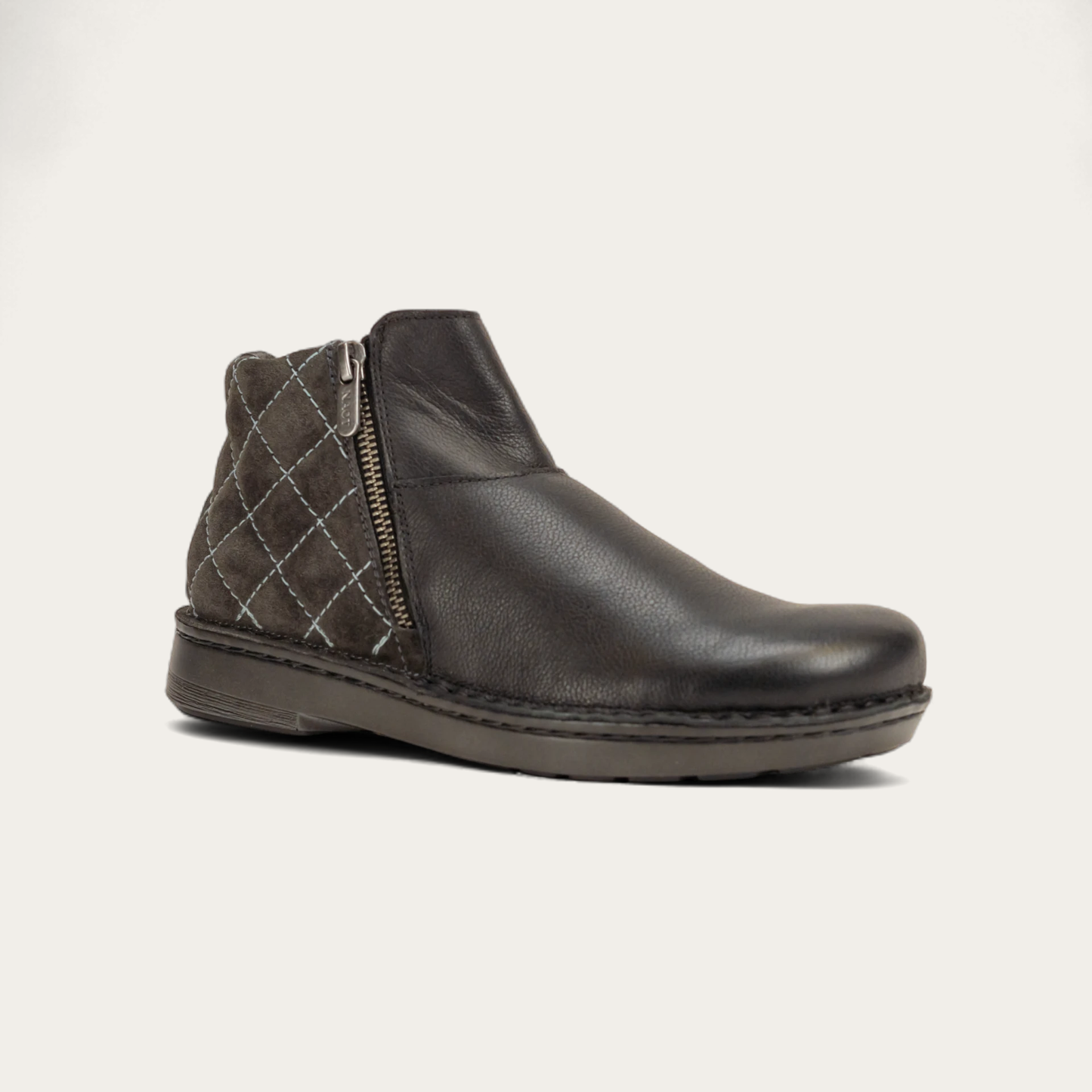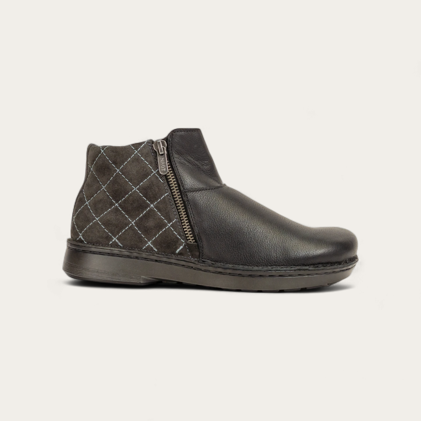 Naot Sintra is a comfy everyday bootie made with soft leather combinations, zipper accent, and quilted details. The Sintra features Naot's anatomic cork & latex footbed is wrapped in a pampering suede and molds to the shape of the foot with wear. American Podiatric Medical Association (APMA) Accepted for promoting good foot health. Sintra fits our Utopia Footbed.