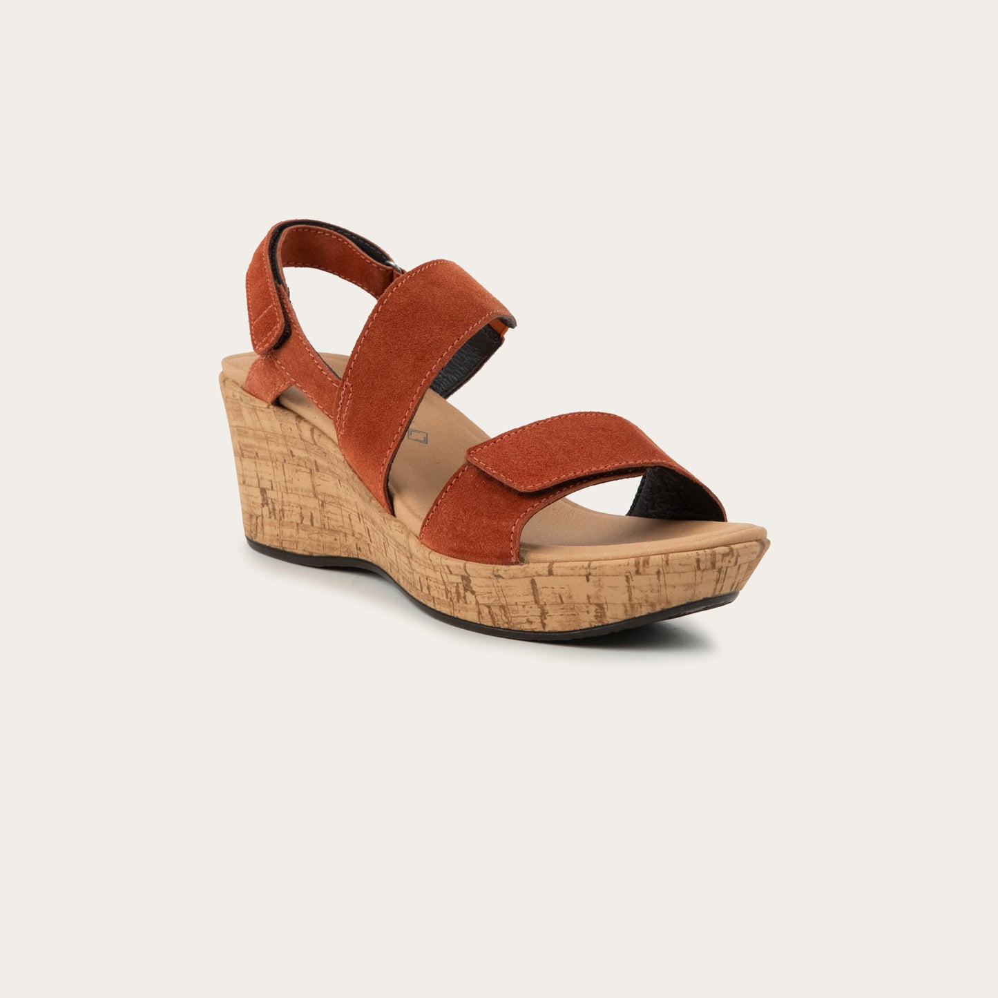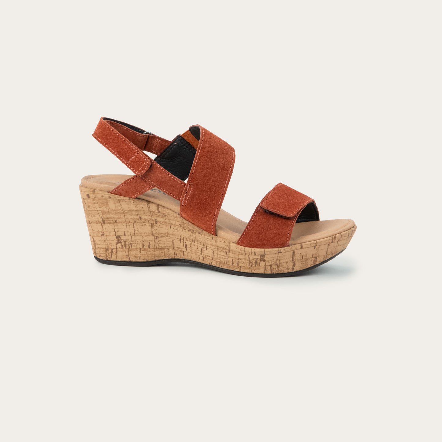 The Sunrise platform sandal features 2.5-inch heels, two Velcro straps, and a wide diagonal strap with rubber for all-day comfort. True to size and part of the Mindful Elegance trend, this versatile sandal pairs sleek design with high-quality materials.