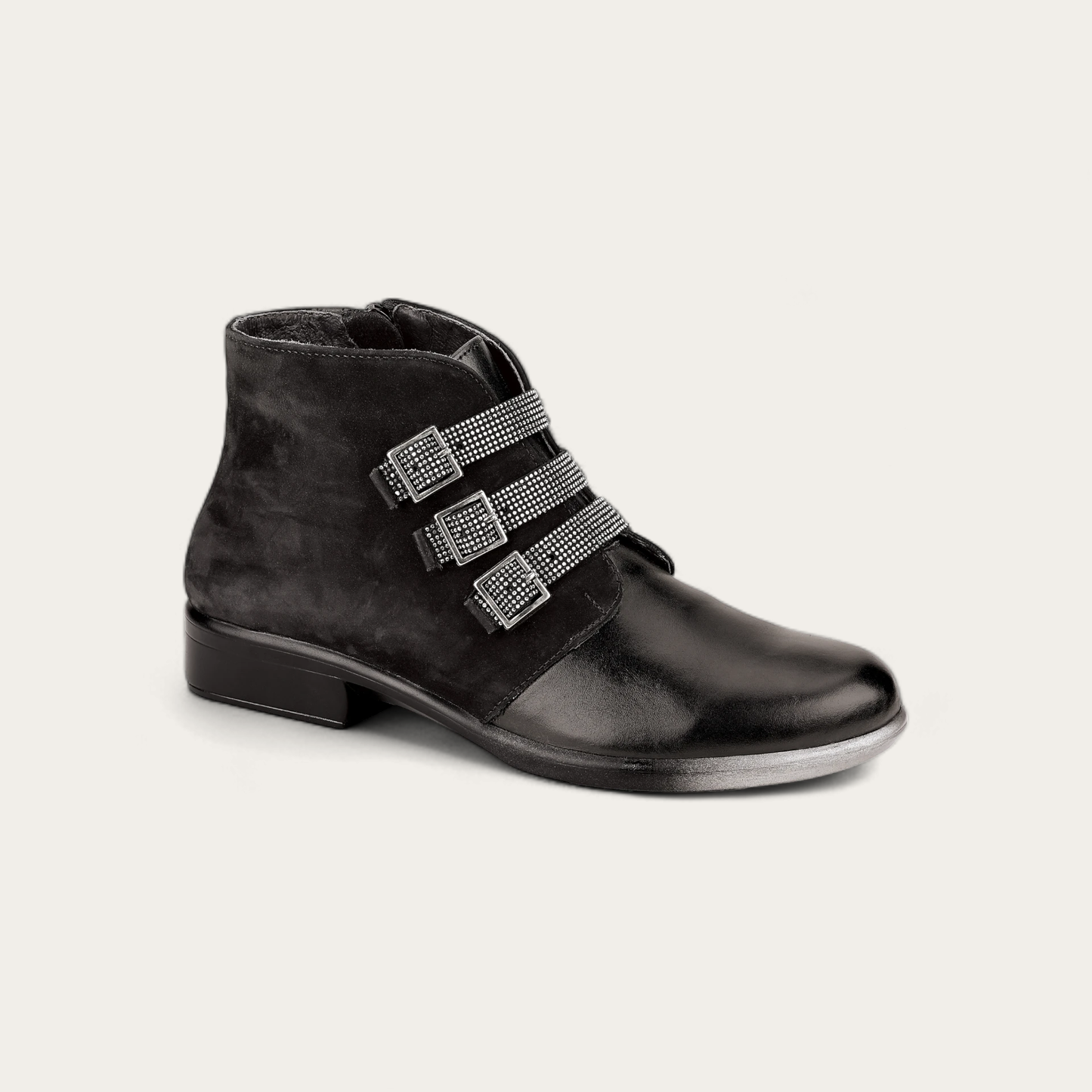 The Naot Vardar is a sleek and dressy ankle boot with a functioning buckle and rivet accents. This boot has padded technical lining for comfort, warmth & moisture absorption. Naot's removable, anatomic cork & latex footbed is wrapped in microfiber & leather and molds to the shape of the foot with wear. The Aura Collection features a 1.5" polyurethane sole with a metal shank which is extremely lightweight, durable & abrasive to prevent slipping. This collection uses a hand-sewn Strobel construction making it strong and extremely flexible. Our patented Naot Replacement Footbeds are available for Vardar. SIZE INFO: * 4" Shaft Height * 10 " Shaft Circumference * Product measurements were taken using size 37 (US Women's 6), Width M * Please note that measurements may vary by size DETAILS: