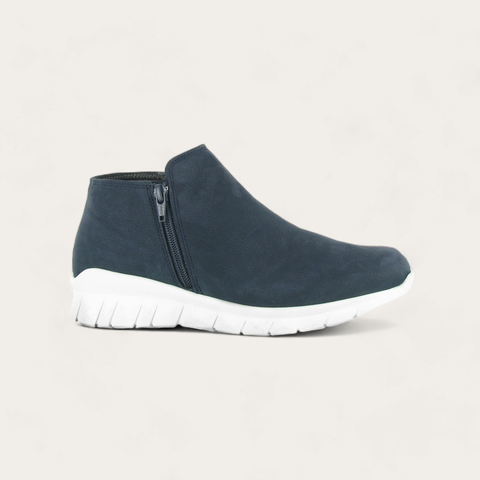 The Zodiac shoe showcases classic shades of smooth nubuck with an eye catching white, slip resistant sole. A cork & latex removable footbed provides all-day comfort. This style contains double zippers for easy on/off and also features padded technical lining for extra comfort. American Podiatric Medical Association (APMA) Accepted for promoting good foot health. The Zodiac fits our Aura Footbed.